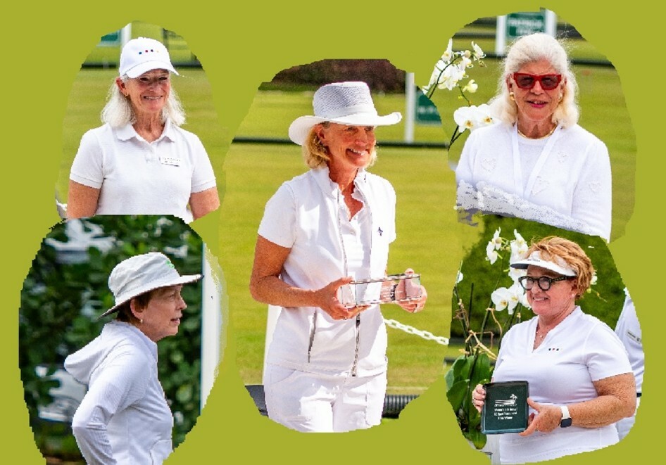 Tournament Champion Cheryl Bromley proudly displays the beautiful crystal perpetual trophy. With Cheryl are Championship Finalist Ana Sanchez de Granda (top right), Championship Shield Winner Beatriz Cabeza de Vaca (bottom right), Championship Bowl Winner Jodie Rugart (top left), and Championship Plate Winner Sabine Martinsone.